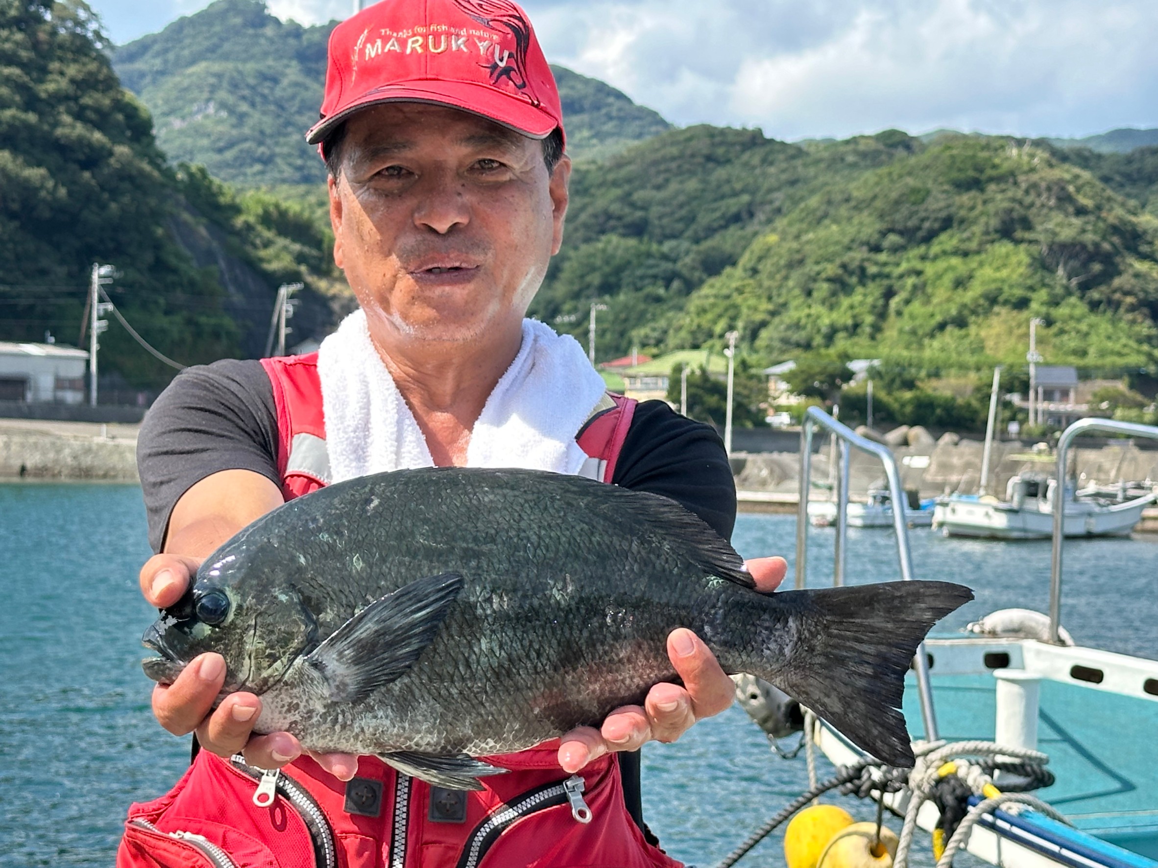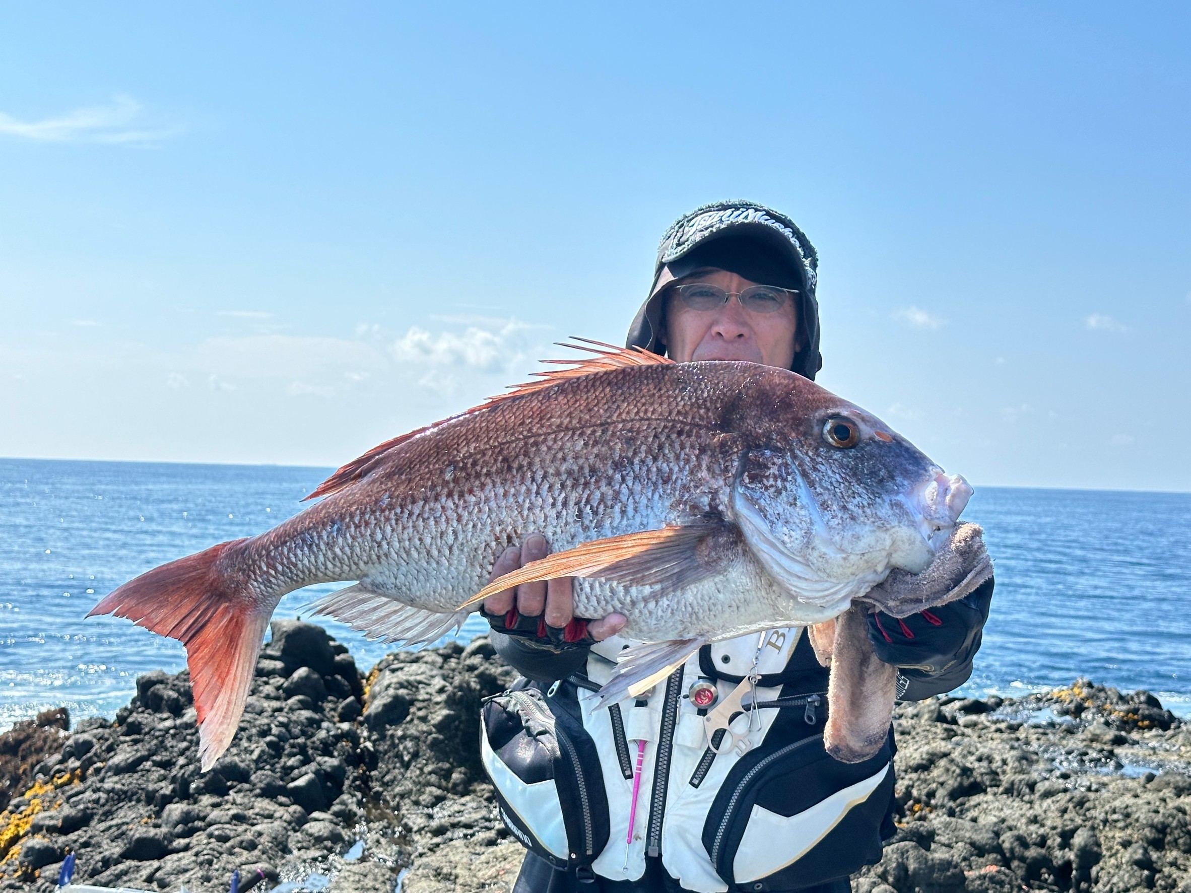 晴時々曇 南西弱 波中 澄 27.0→28.5℃大型真鯛HIT!!80.2cm 5.93kg上がる!!各磯のイサキは20→32cmまで10→20本でした。石鯛狙いは小型の石鯛が2匹でした。